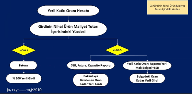 *Fatura tutarı; nihai ürün maliyet tutarının %0,5’inin üzerindeki girdiler; tedarikçinin sanayi sicil belgesinde varsa Yerli Oranı %40 kabul edilir. Ancak girdi için ayrıca “Yerli Malı Belgesi”/”Yerli Katkı Oranı Raporu” tanzim edilmiş ise oradaki oran dikkate alınır.